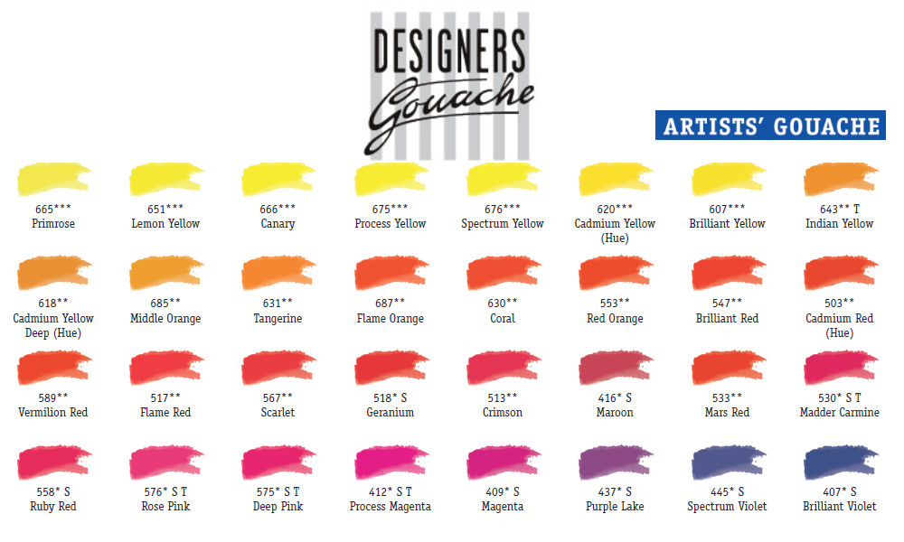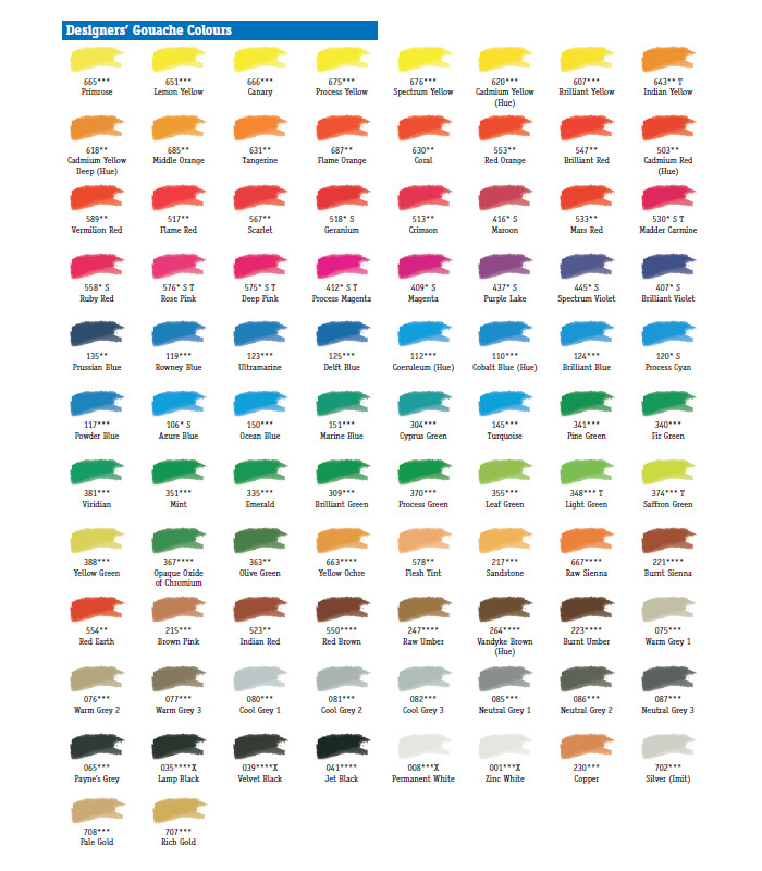 Designers Gouache is a brilliant, opaque, artist-quality body colour, developed for professional designers working on illustrations for graphic reproduction. It is also widely used in fine art painting, both on its own and with transparent watercolours.