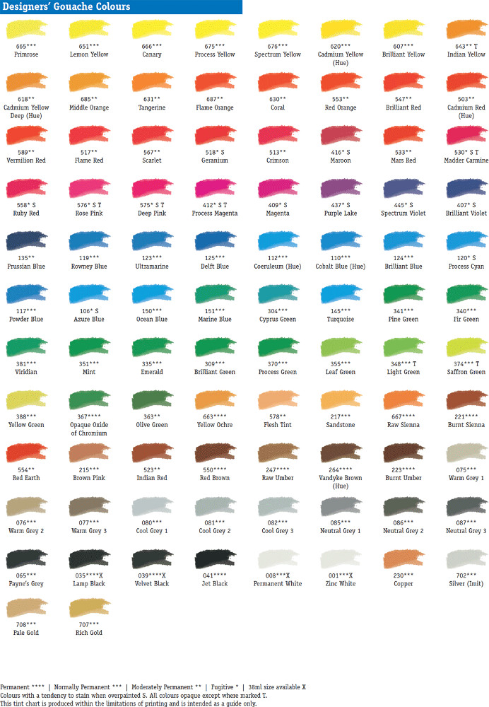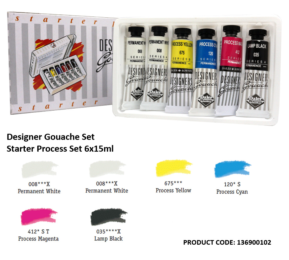 – 6 x 15ml tubes. 3 process colours with black and white to have the basic colours to paint with Designers' Gouache.