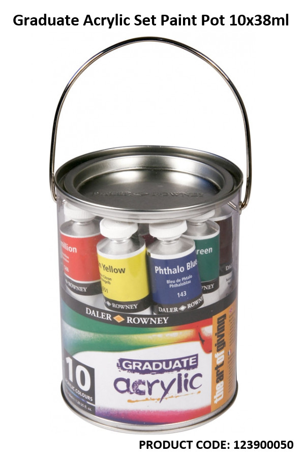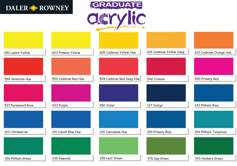 Graduate Acrylics offer a very affordable range of acrylic colours. The range features bright and strong colours that are easy to brush onto surfaces. They can be used on any paper surface, primed board or canvas, used indoors or outdoors. They are so versatile they can also be used with a variety of acrylic mediums, also available from Daler-Rowney.