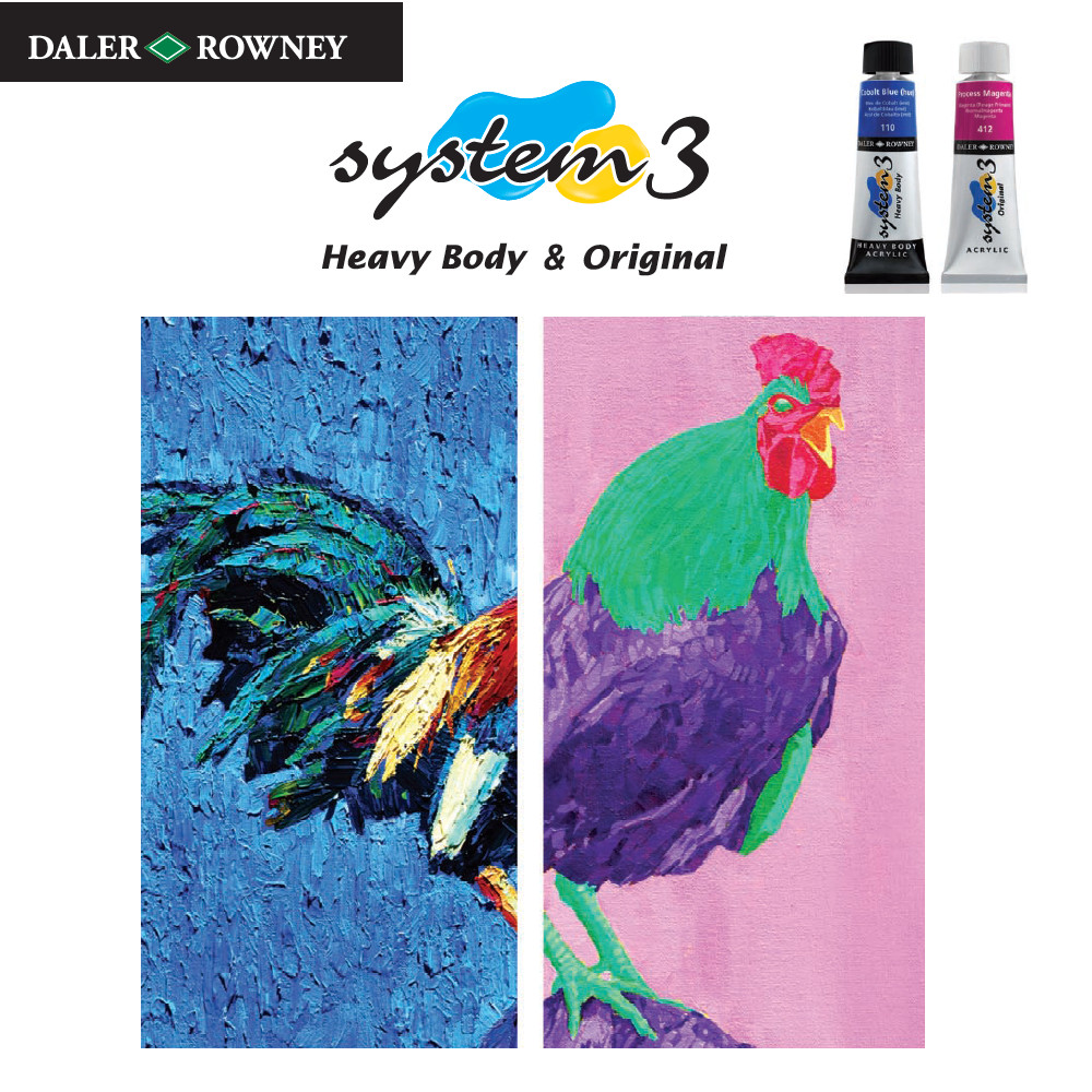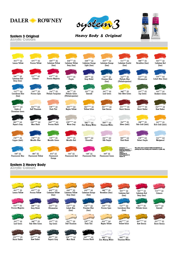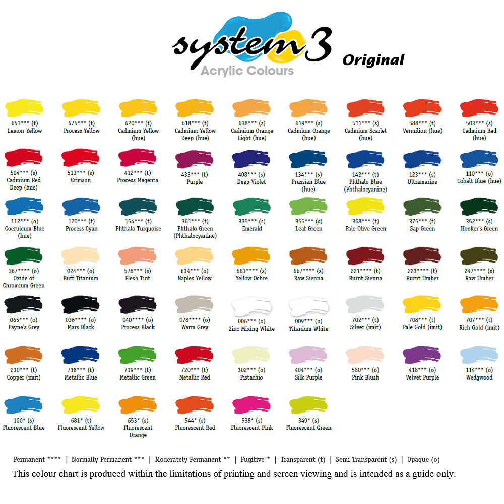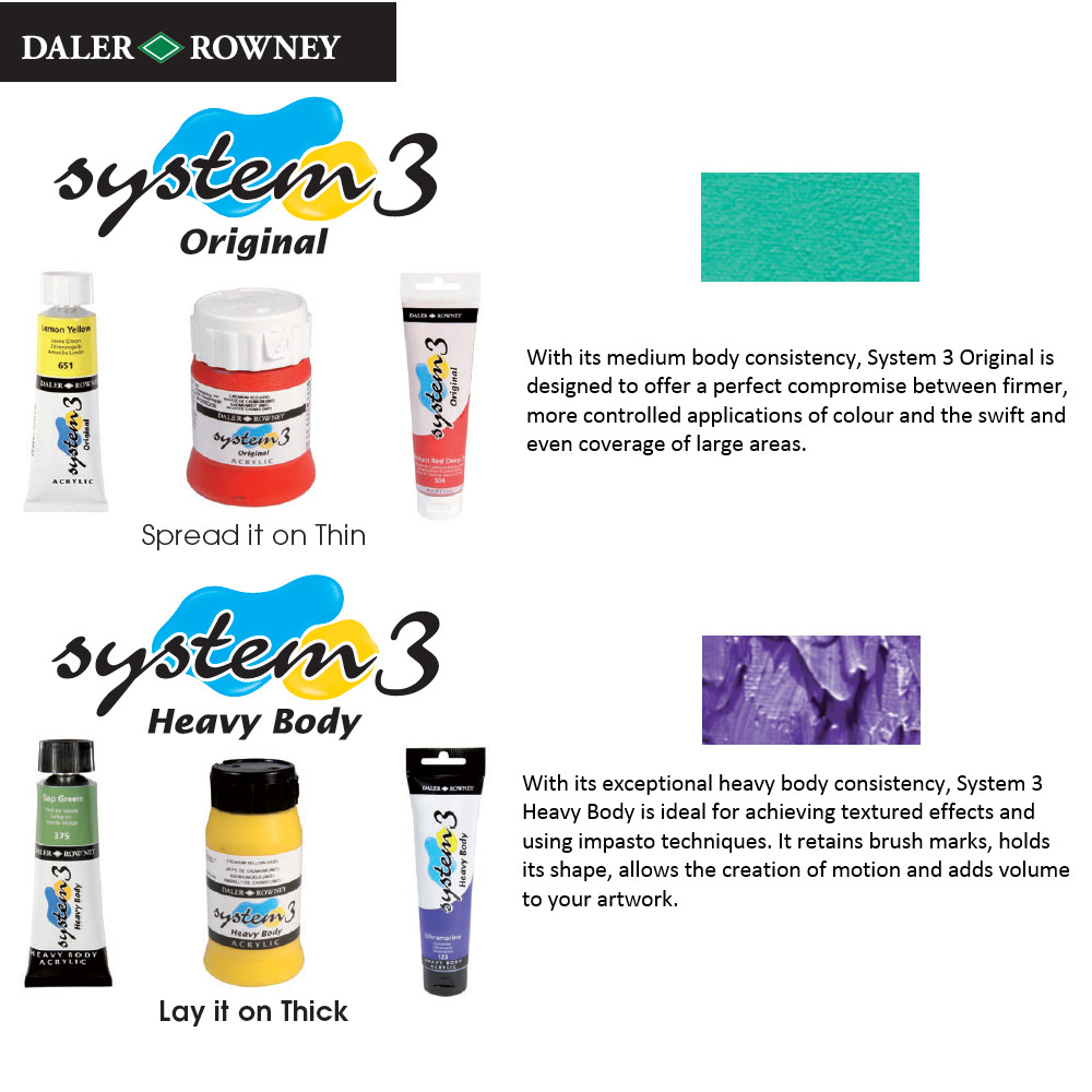 With Original and Heavy Body versions, System 3 acrylics are highly versatile, water-based acrylic colours. They offer an excellent painting experience at an economical price. Only high-quality pigments are used in the manufacture of the System 3 acrylic ranges, offering significantly greater loading than in other acrylic ranges available in this class. System 3’s comprehensive range of colours offers excellent light-fastness, permanence, durability and covering power.
