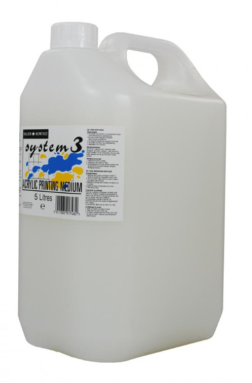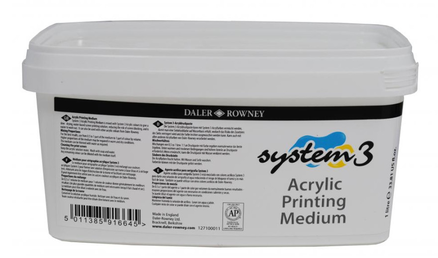This medium slows down the drying of acrylic colour on the screen and reduces the risk of the screen being blocked, making it easier to wash out. The medium can be thinned with water. System 3 Acrylic Colours retain great density of colour even after mixing with medium and very substantial covering power can be achieved on paper, card and board without undue cockling.