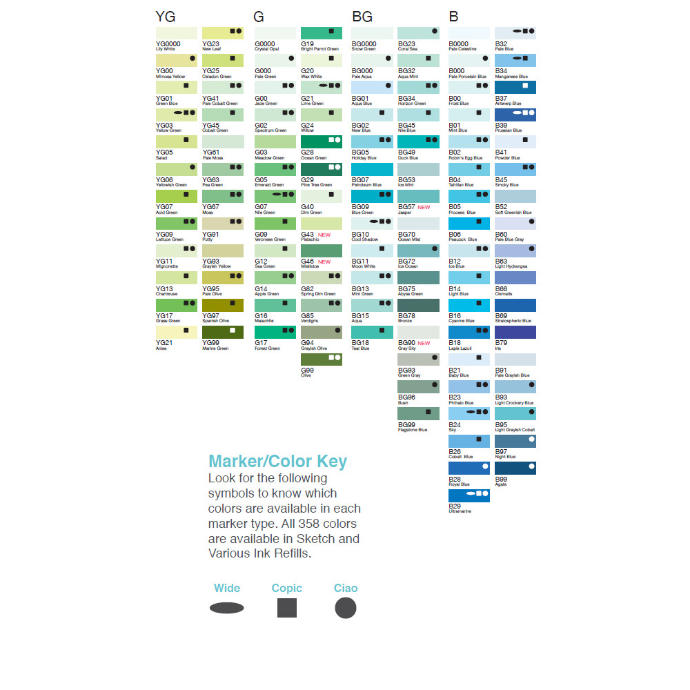 For the Colourless / Blender - this is a multipurpose clear marker which is the base liquid for all Copic inks. It ‘bleaches’ inks by pushing color through the back of the paper. This tool is useful in range of standard and experimental techniques.