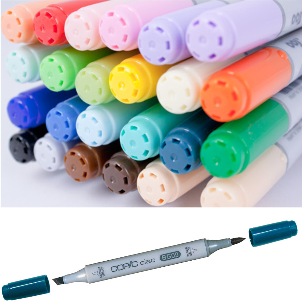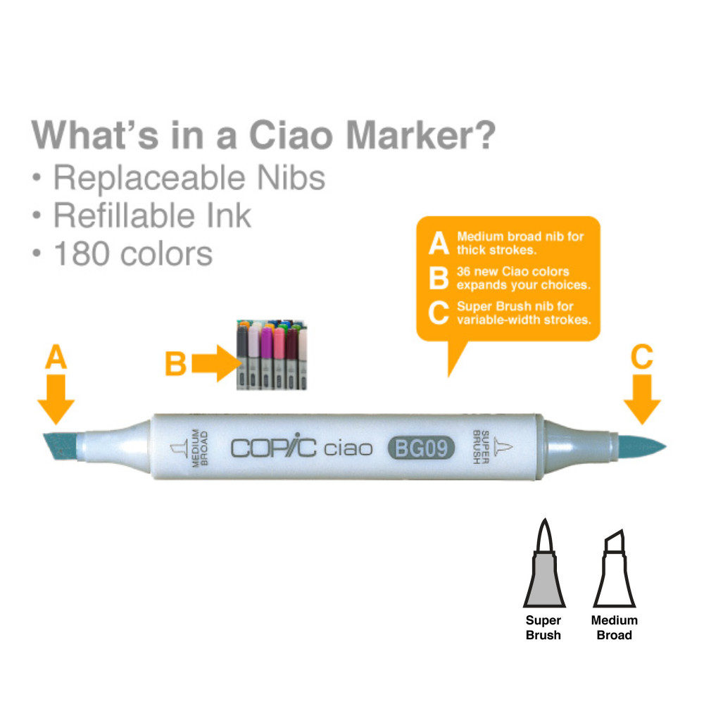 Ciao Markers offer all the features of our Sketch Marker, but in an economical size. With 180 colours available and featuring the same replaceable Super Brush and Medium Broad nib and refillable ink, the Ciao matches the Sketch in every area of quality for a lower price.